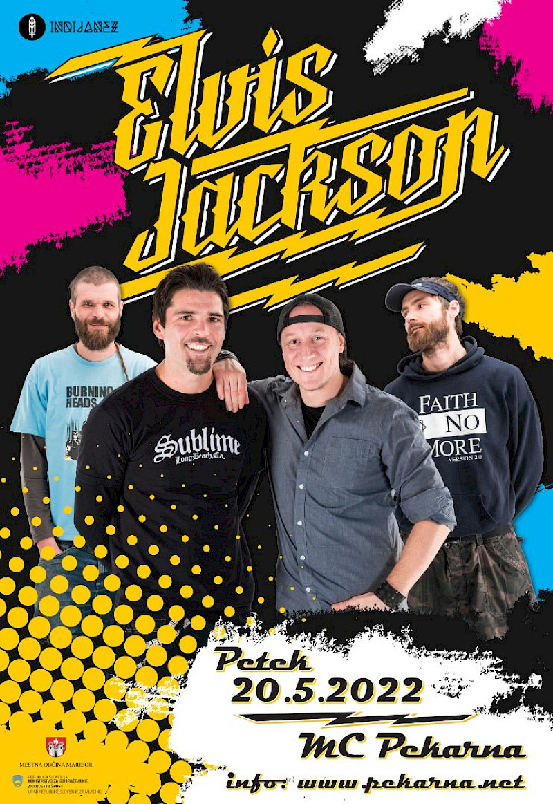 Plakat za koncert slovenske skupine Elvis Jackson v klubu MC v KC Pekarna Maribor.