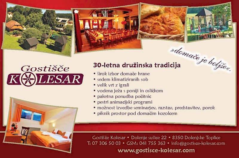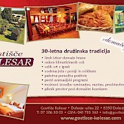 Oglas za gostišče Kolesar z 30 letno tradicijo ter širokim izborom aktivnosti.